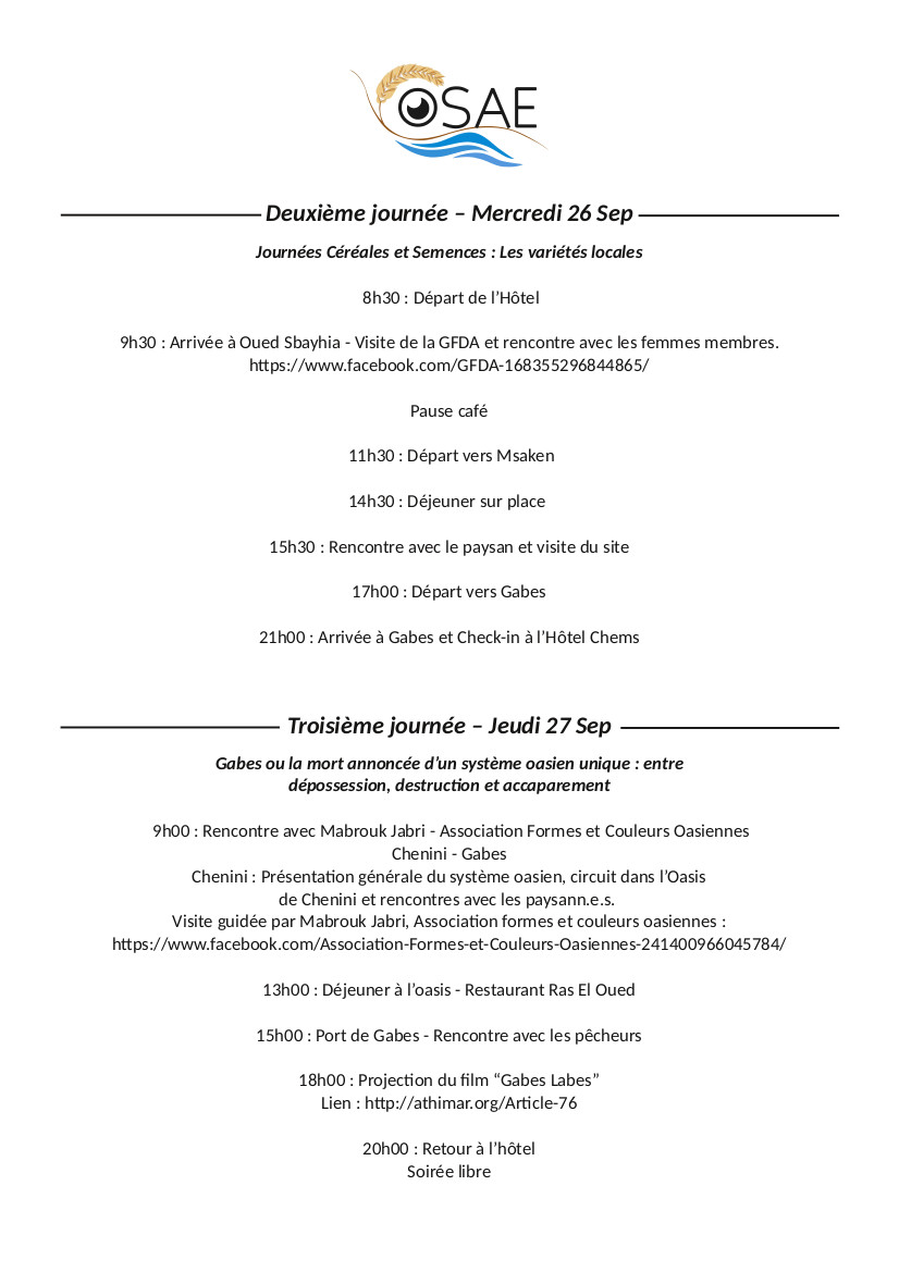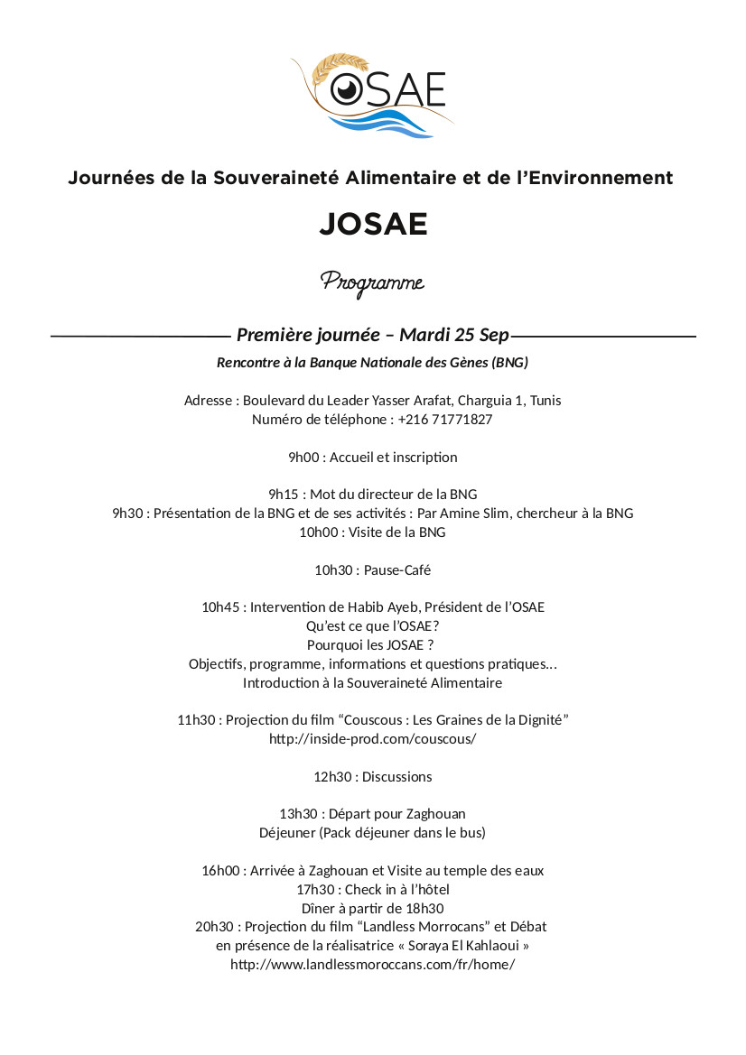 La première rencontre aura lieu du 25 au 30 septembre 2018 au fil d’un parcours itinérant qui vise à créer les conditions idéales de rencontres mutuellement enrichissantes entre les participant.e.s et acteurs et actrices du monde rural, en premier lieu les paysan.ne.s. Partant de Tunis, passant par Zaghouan, Msaken et arrivant à Gabès, ce “voyage” abordera les problématiques et question propres à chaque étape : rencontres avec des paysan.ne.s et des membres de la société civile, visites de sites et d’exploitations agricoles et visites « institutionnelles » notamment à la Banque Nationale des Gènes (BNG), lors de la première journée (25 septembre).